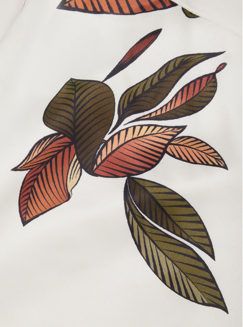 NOMI - Elegancka biała satynowa sukienka to idealny wybór na wyjątkowe chwile. Zaprojektowana z myślą o podkreśleniu figury, ma zgrabną sylwetkę z delikatnym wiązaniem w talii dla romantycznego, kobiecego akcentu. Subtelny nadruk liści dodaje wyrafinowanego, naturalnego akcentu, a głęboki dekolt w kształcie litery V i zawijana spódnica z rozcięciem z boku tworzą idealną równowagę między elegancją i powabem.