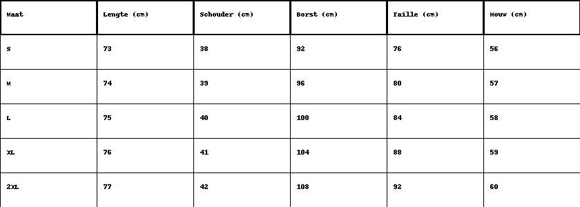 | Rozmiar | Długość (cm) | Ramię (cm) | Biust (cm) | Talia (cm) | Rękaw (cm) |